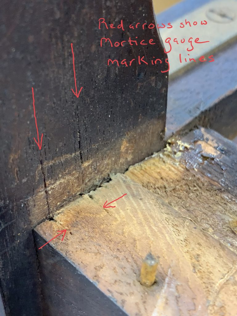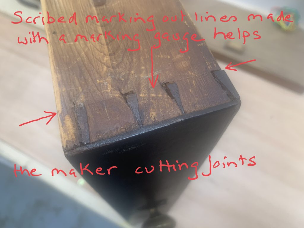 Without doubt this table has been largely handmade. I say largely handmade because the evidence is there, but we also know that machines have been used in woodworking from approximately the late 1700’s & the UK had a myriad of carpentry shop producing all type of timber products. A former heavily industrial town like Dudley and its surrounding areas would have had many woodwork shops. Measuring the parts will begin to reveal constructional methods, particularly when tool marks can be seen & thus joint construction inferred. The next two photos show marking gauge lines indicating that the joints were marked out and ultimately cut by hand.