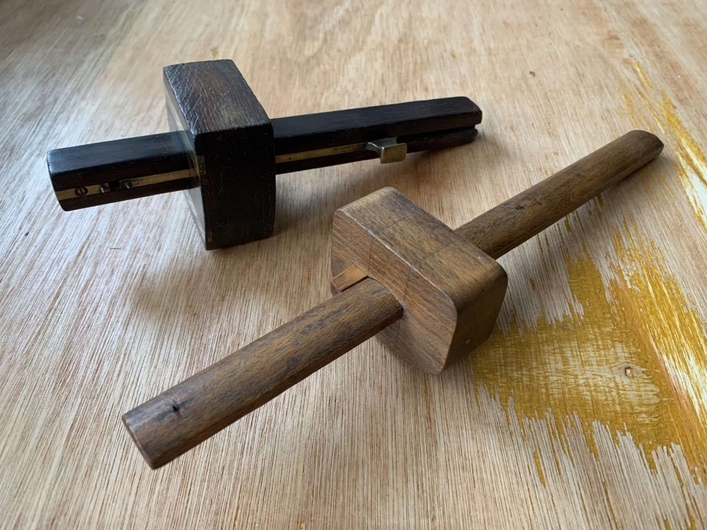 And here we’ve have a photo of two vintage marking gauges. The Rosewood tool marks the double lines and the lighter colour Beechwood gauge the single lines. Of note the Beechwood gauge is craftsman made, if you look carefully on the stock you can see scribed lines made by the craftsman to guide his cut lines.