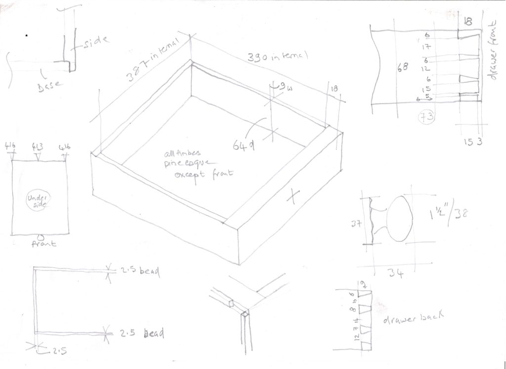 This picture is of a mid 1800’s kitchen table that we have in our Heritage Workshop, At present there’s no definative way of determining this piece of furniture’s real age or its original intended use. Having a good close look and having some contemplation time might help narrow down dates. I think that there is no better way of having a close look at a piece of furniture than measuring it to produce a technical drawing. The scan is of notes made which will help in the production of a drawing.