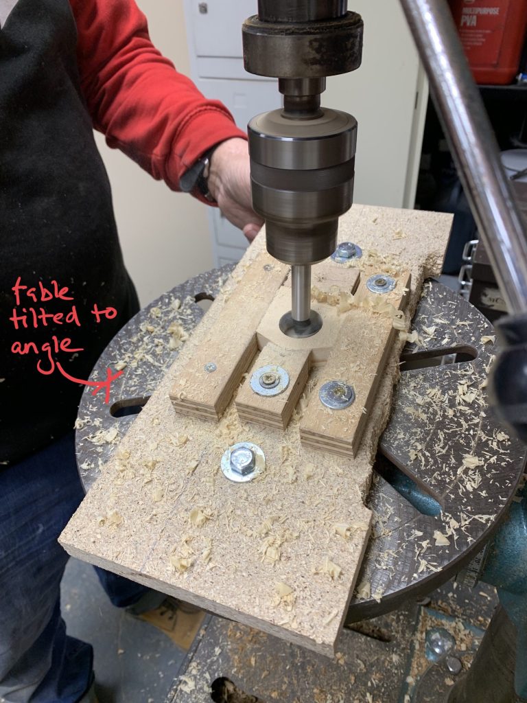 To cut the chair pockets we made a holding jig from scrap that mounted onto the tilting table of the drill.
