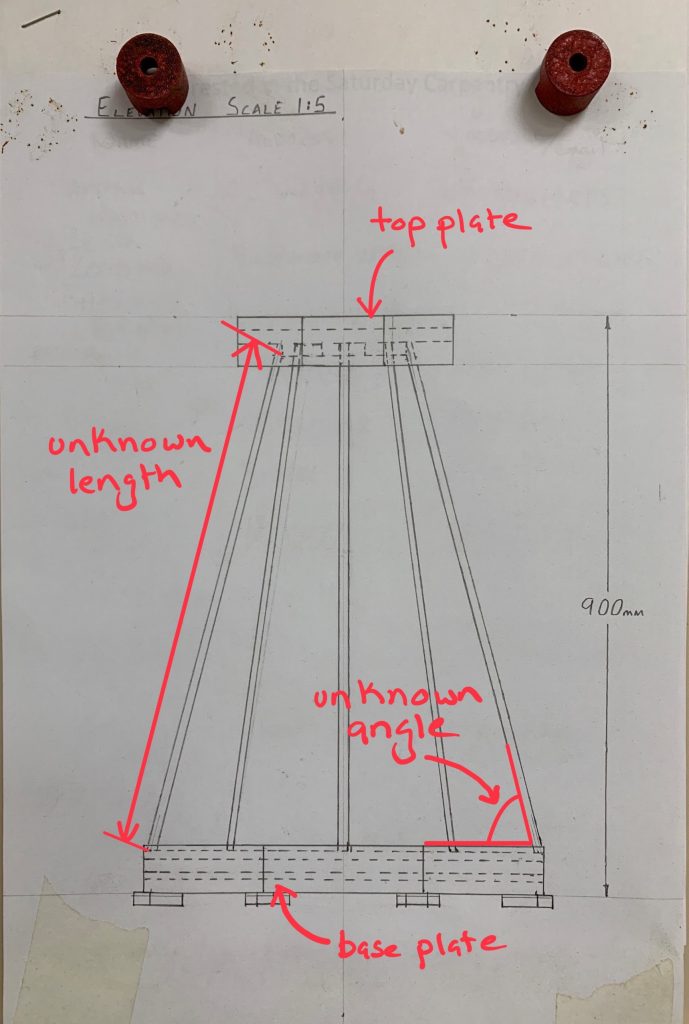 Our workshop has a number ‘inherited’ projects. One of these is a processional cross (pictured) that needs a stand. For this we have an incomplete set of design drawings. Already constructed are the base and top plates and we have material for the stays. Here is one of the drawings that we have. It has been annotated to show a couple of difficulties that we need to solve.