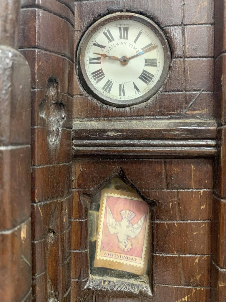 Below the clock the window has an ecclesiastical stamp. We imagine that this was to represent stained glass windows. Recently we’ve met some elderly parishioners who confirm that these stamps were given out at Sunday School to attendees.