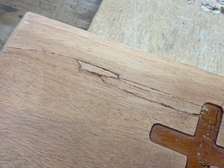 On such jobs we use a variety of adhesives. On this one we used PVA, superglue and epoxy resin. Each glue has its own characteristics that can be used advantageously in a repair. If repair work interests you the ‘moral’ gleaned here is learn you glues. Worth noting that whilst superglue is a glue that its name suggests glues everything it doesn’t. So you need to learn your glues, what they do, how long they take to set etc. Slowly, piece by piece the broken bits are glued together. And here we’re part way done. The joins can be seen but after finishing the hope is that they will disappear.