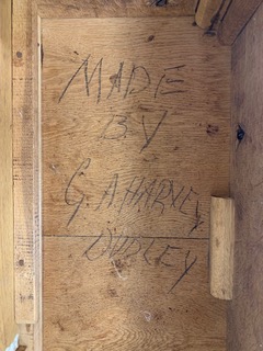 This table is in our workshop. We think that it was made, judging by its style, in the 1930’s. We know it was made by GA Harvey in Dudley because it is signed on the underside.