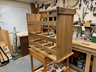 This was a piece of self assembly knock down furniture. A flat pack if you like. The main problem was that its fixing screws had loosened and needed tightening. In addition to the loose screws a bass bar had dropped out because they had been fitted dry. Gluing that back into place and tightening the screws brought stability back to the unit.