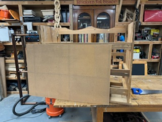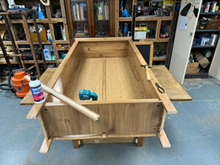 Working comfortably tends to give better results and that often means a job can move across different heights of workbench and this one finished on the floor to have the back finally pinned in.