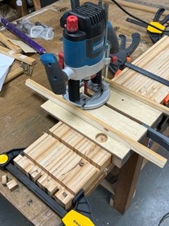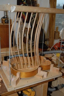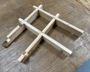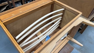 And finally one of our trainees has been repairing and refurbishing a G Plan Gold label chest of drawers. The drawer runners that are inside the carcass needed re-gluing. For successful gluing pressure needed to be applied to the runners, however conventional clamps (certainly the ones we have) do not reach. To solve this we’ve cut some narrow strips of wood that are slightly longer than the width between the runners. When these strips are flexed and released into place they provide excellent clamping pressure. In olden days this technique was used to put pressure on very large pieces of furniture including harpsichord and piano cases.