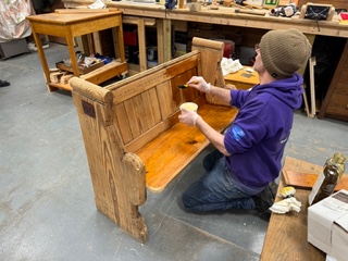 The pews have been hand stripped of their historic varnish and refinished with boiled linseed oil. The photo shows one of our trainees applying the finish.