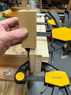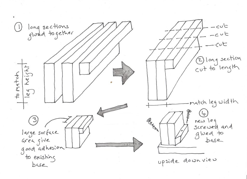 Here are the new legs in place. They are much chunkier than the originals legs but they were designed that way as we needed a large surface area to glue them onto the wardrobe and span between the repair and ‘solid’ wood.