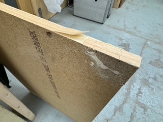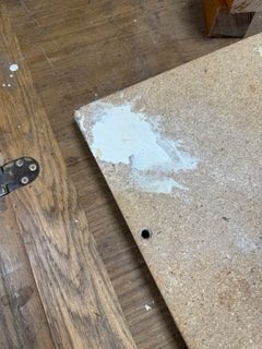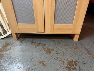 We have a repair of a wardrobe’s broken leg. Much of this type of furniture may look good in a catalogue but can be very fragile when moved. And as you can see both its leg and a corner of the chipboard base have broken off. This furniture is fragile. This is what the legs looked like originally.