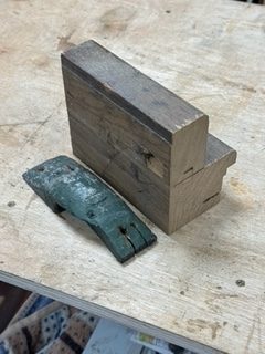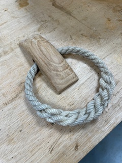 This is the inside lid of a seaman’s chest from 1875. On the outside it has two rope handles. These have long since gone and the wooden bosses that hold them are damaged. Apart from an overhaul of the chest we need to make a new pair of bosses. These will be from oak as per the originals. Here’s a picture of a finished boss to give you an idea of what we’re talking about. In many ways the important thing in this job is the sequence of operation. Get the sequence right and the job has a better chance of turning out well.