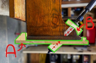 Because of the awkward shapes of the parts, we will have difficulty clamping them. Trying to apply clamps in a conventional manner the clamp will just slip off. To prevent the clamp slipping off, we make ourselves a clamping caul. A caul is simply a shaped piece of wood that will help us apply pressure in a manner that a clamp alone cannot do. The following photo shows that we have used two cauls. Caul A has been fabricated from timber offcuts whereas caul B has been cut to fit.