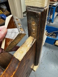 When the parts have been cleaned as best we can, being mindful that too much cleaning will remove wood and then the parts will not fit particularly well, we drill a series of depressions on the faces to be glued which will increase the gluing surface area.