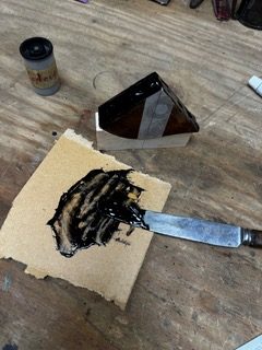 We will be using epoxy resin coloured with Black powder. If we were to use almost any glue in its ‘ natural ‘ state the glue line will almost invariably show as an off white colour. What we are aiming to do is fool the eye by making the glue line Black which will be a closer match to the grain lines of the wood being repaired .